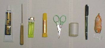 |  | 左から、フックホールシーラー、千枚通し、ライター、瞬間接着剤、ハサミ、ミシン糸、油性ペン、そしてフロッグ。 フックホールシーラーを除き、どこの家庭にもあるものです。 糸は、細めのPEラインを使用すればより強固になります。 |