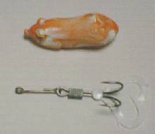 | 製品についてくるツインテールは、そのまま利用しても良いのですが、雷魚2,3匹釣るうちに取れてしまう(雷魚が飲みこんでしまう可能性もある)ので、私の場合初めから切ってしまいます。 そして、フックホールシーラーをフック穴周辺に塗りつけ、穴を塞ぎます。フックホールシーラーは肉痩せするので、乾いた上から2、3度重ね塗りすると良いでしょう。 | |