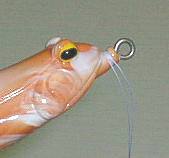 |  |  | 瞬間接着剤が固まるのを待ち、ボディに通します。 ボディに通すときは、針金で輪を作ったものにアイを通し、フロッグの口のところから引っ張ると良いでしょう。 |
