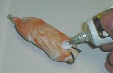 |  | 最終的にはフロッグのフック穴を塞いでしまうため、雷魚が食いついたときにきちんとボディがつぶれるよう、空気抜きの穴を開けます。 ライターで熱した千枚通しをボディに刺せば簡単に穴が開きます。 穴を開ける場所は色々好みがあると思いますが、この位置だと水が入りにくく、また水が入ってもキャストのときに遠心力で水が抜けていくので、便利だと思います。 |